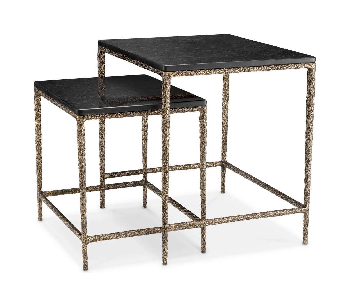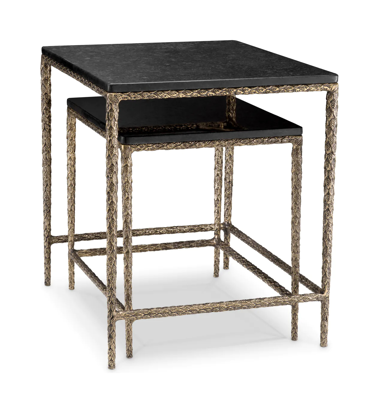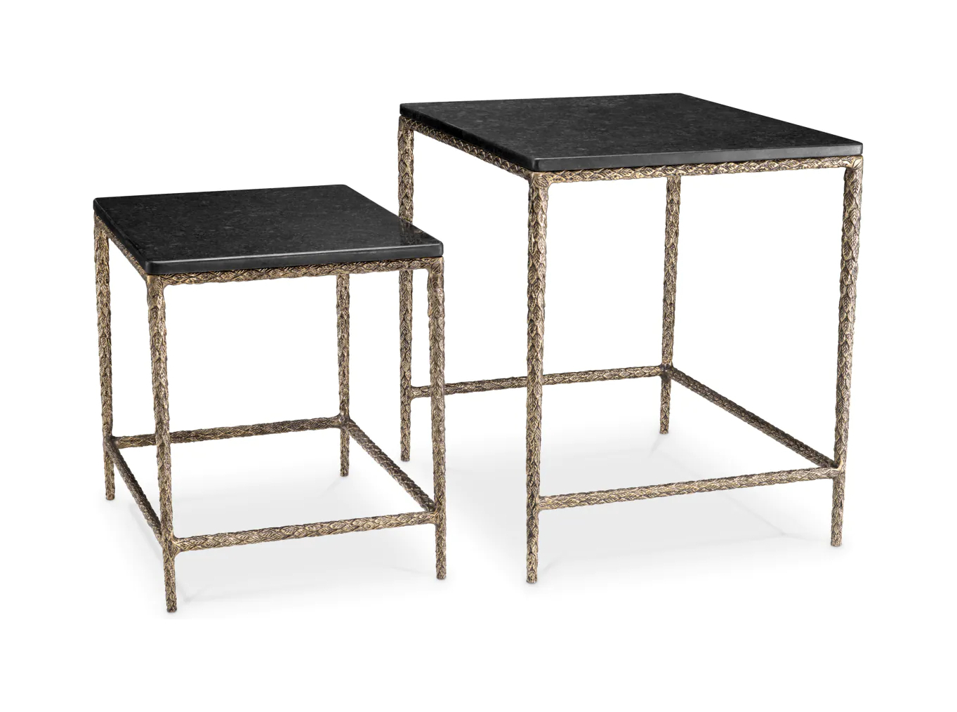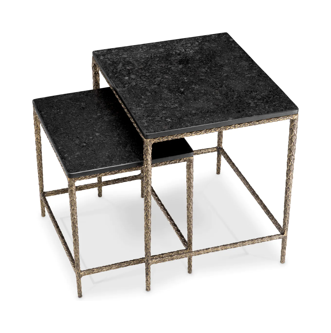 Два стола ручной работы с чёрными гранитными столешницами установлены на винтажных латунных основаниях разной высоты. Их можно использовать как по отдельности, так и вместе — они создают элегантный динамичный дуэт.