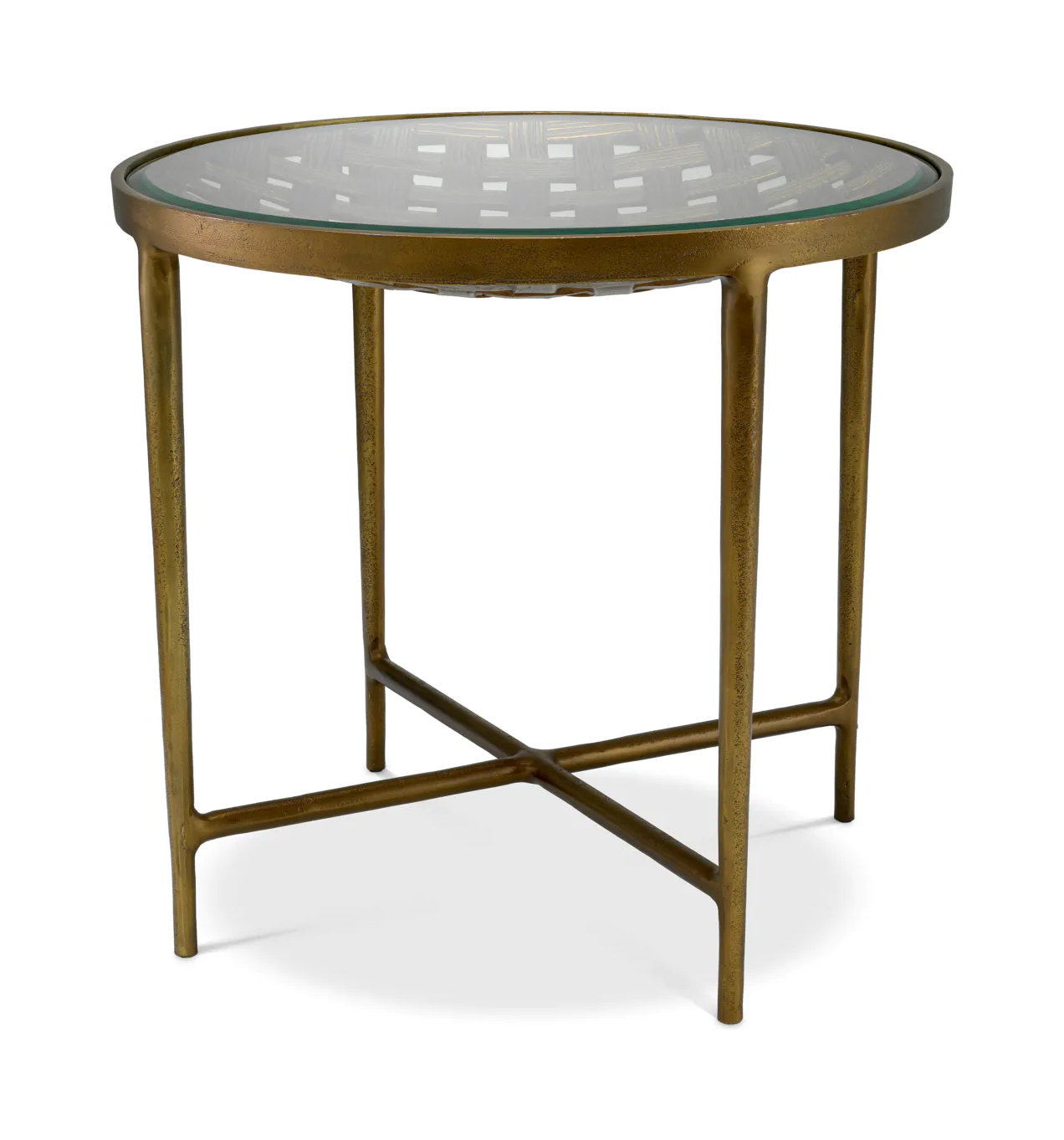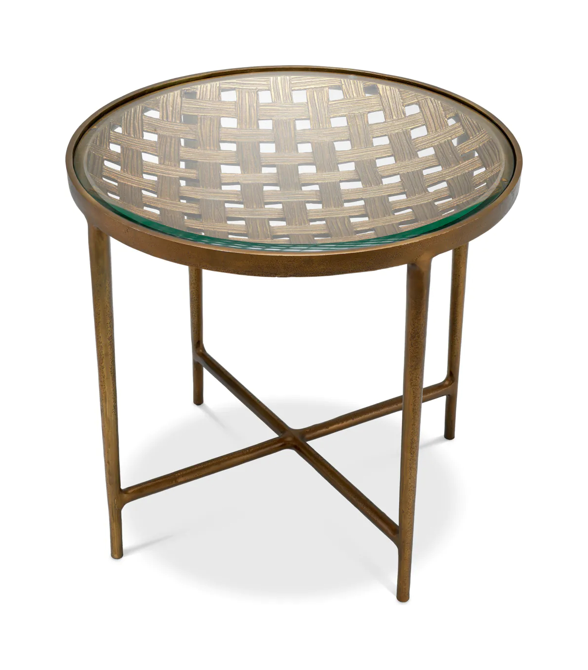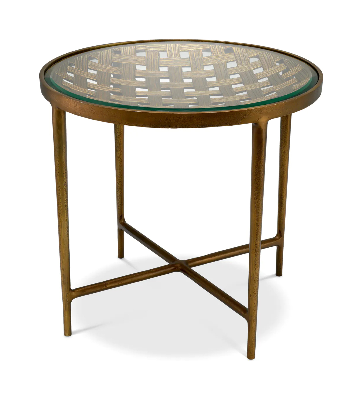 Приставной столик Sorrento — воплощение элегантности в интерьере. Прозрачная стеклянная столешница и отделка под античную латунь дополнены изящным плетёным узором. Изысканный предмет мебели для истинных ценителей роскоши.