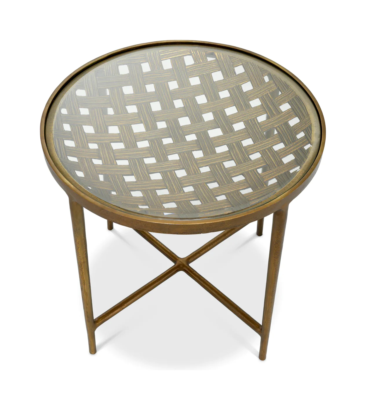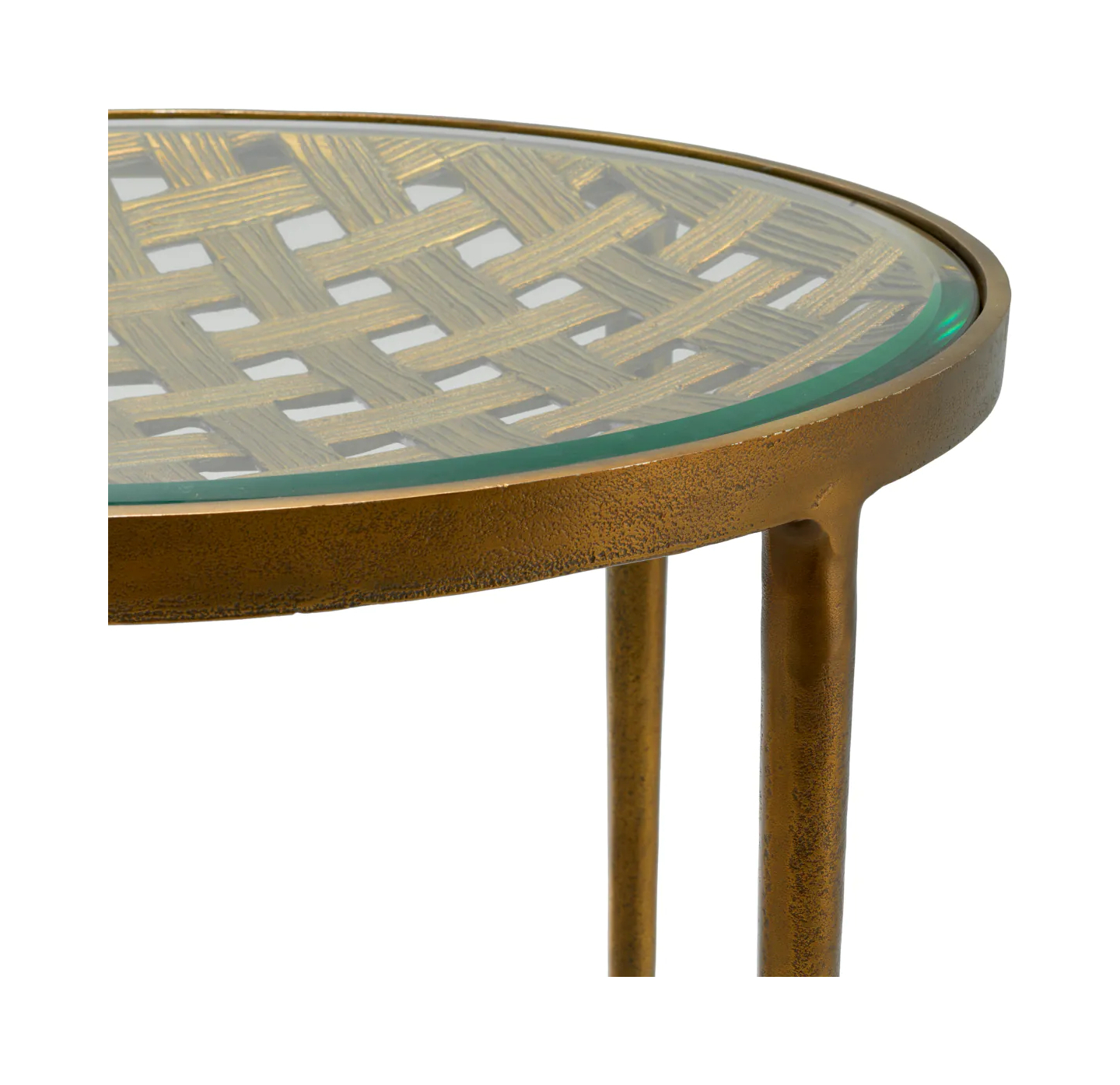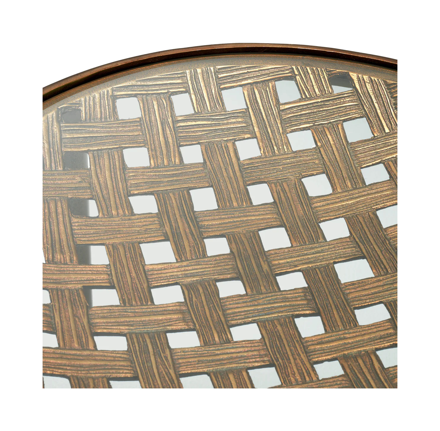 Приставной столик Sorrento — воплощение элегантности в интерьере. Прозрачная стеклянная столешница и отделка под античную латунь дополнены изящным плетёным узором. Изысканный предмет мебели для истинных ценителей роскоши.