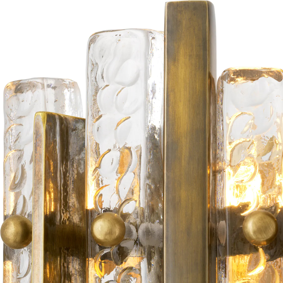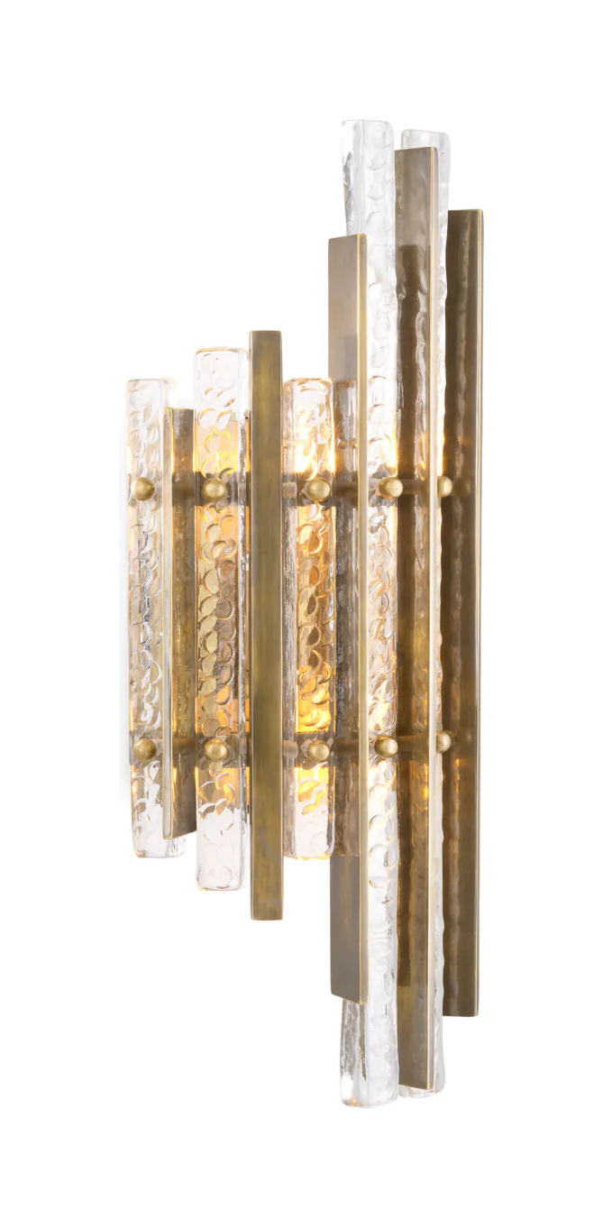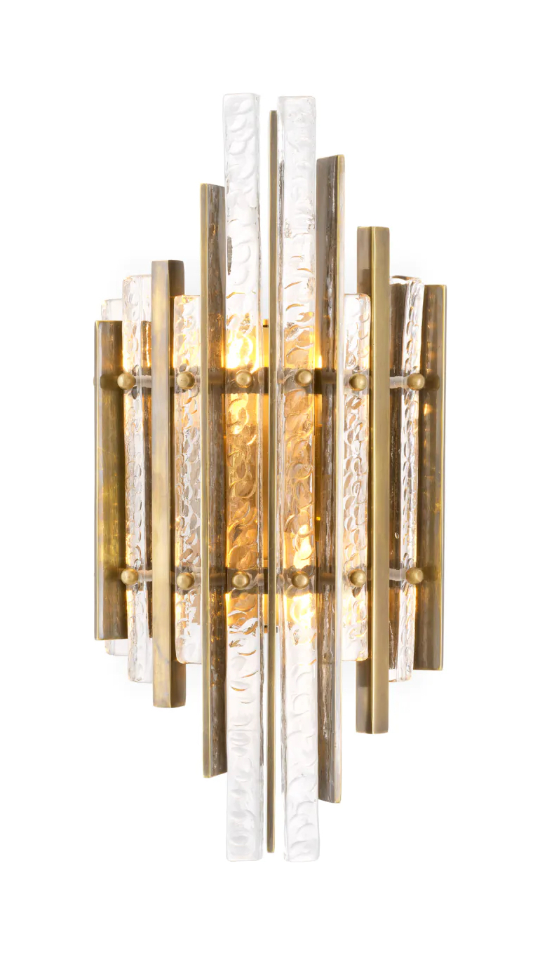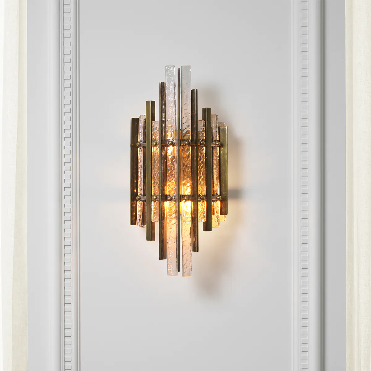 Настенный светильник Leonora — воплощение роскоши в каждой детали. Стеклянные панели ручной работы с изящным узором и винтажная латунь создают утончённую атмосферу элегантности и стиля.