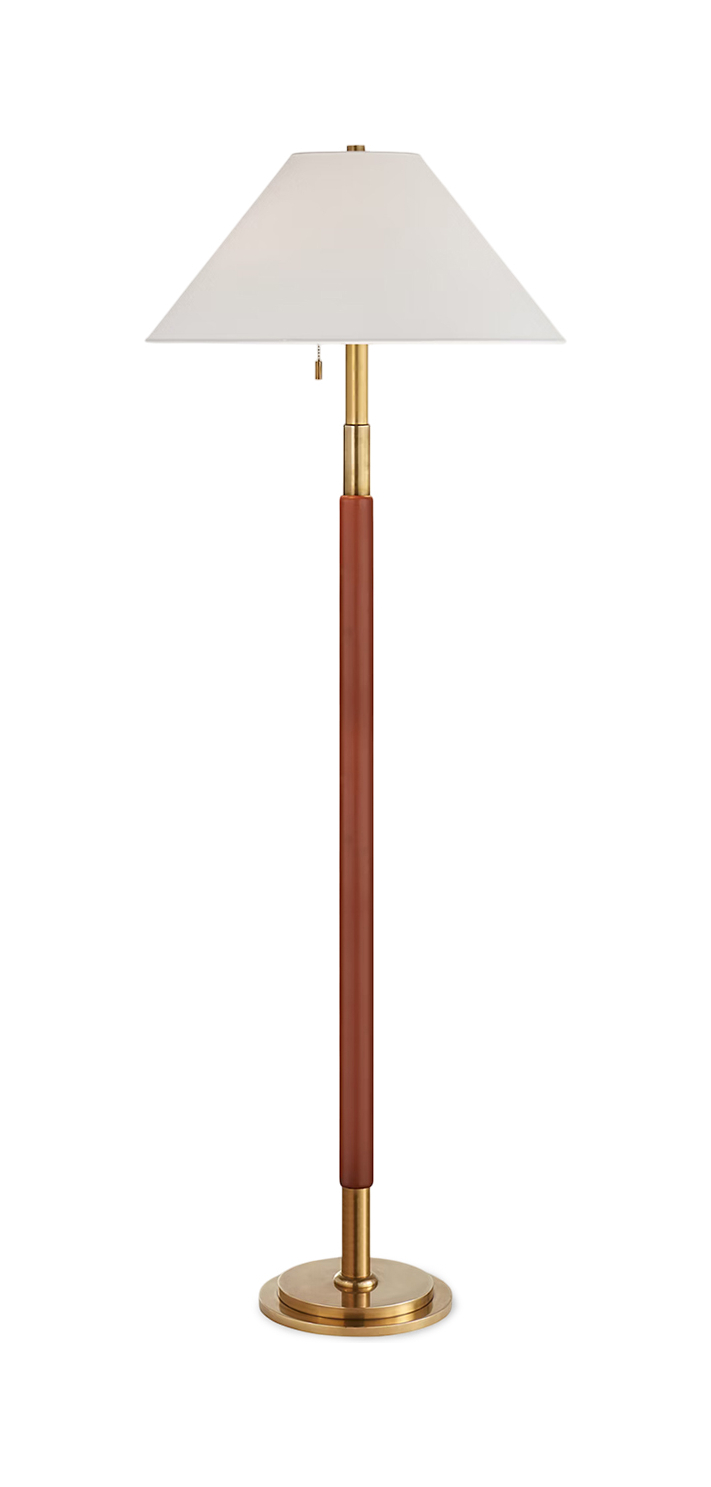 Торшер Garner представляет собой роскошное сочетание благородной латуни и изысканной рыжей кожи, создающее неповторимый акцент в интерьере. Изящная регулируемая конструкция торшера выполнена из цельной латуни, которая придает изделию прочность и роскошный внешний вид. Отделка из мягкой натуральной кожи рыжевато-коричневого оттенка и конический абажур из хлопковой перкали гармонично дополняют линейный силуэт светильника, придавая ему утонченный характер. Выключатель с цепочкой совместим с диммерами.